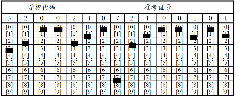 说明: 1、准考证号共十五位。前五位是学校代码。2、此为320021072100101示例图,请按实际准考证号正确填涂。3、填涂前请看清答题纸上的填涂说明。