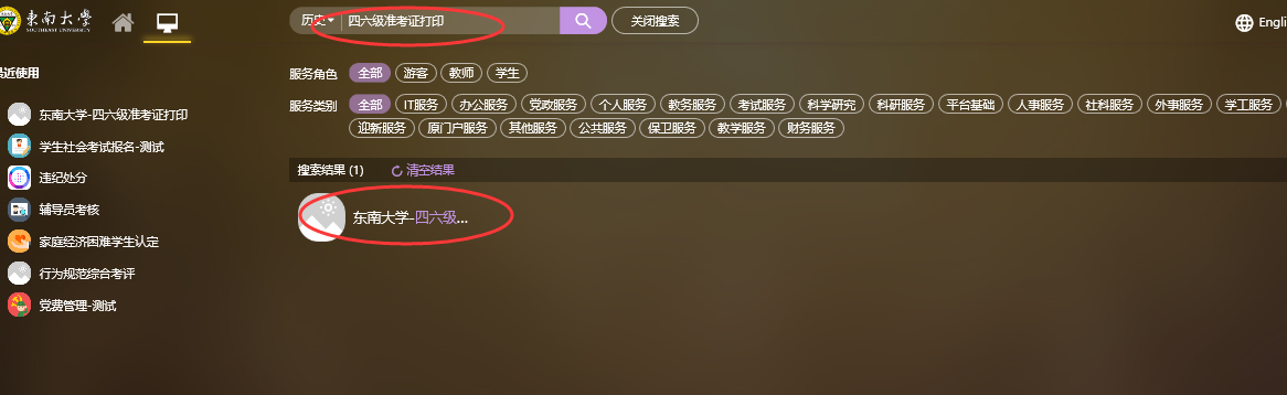 2、点击中间搜索框,输入“四六级准考证打印”,点击查询图标。找到东南大学-四六级准考证打印APP(如图二)。