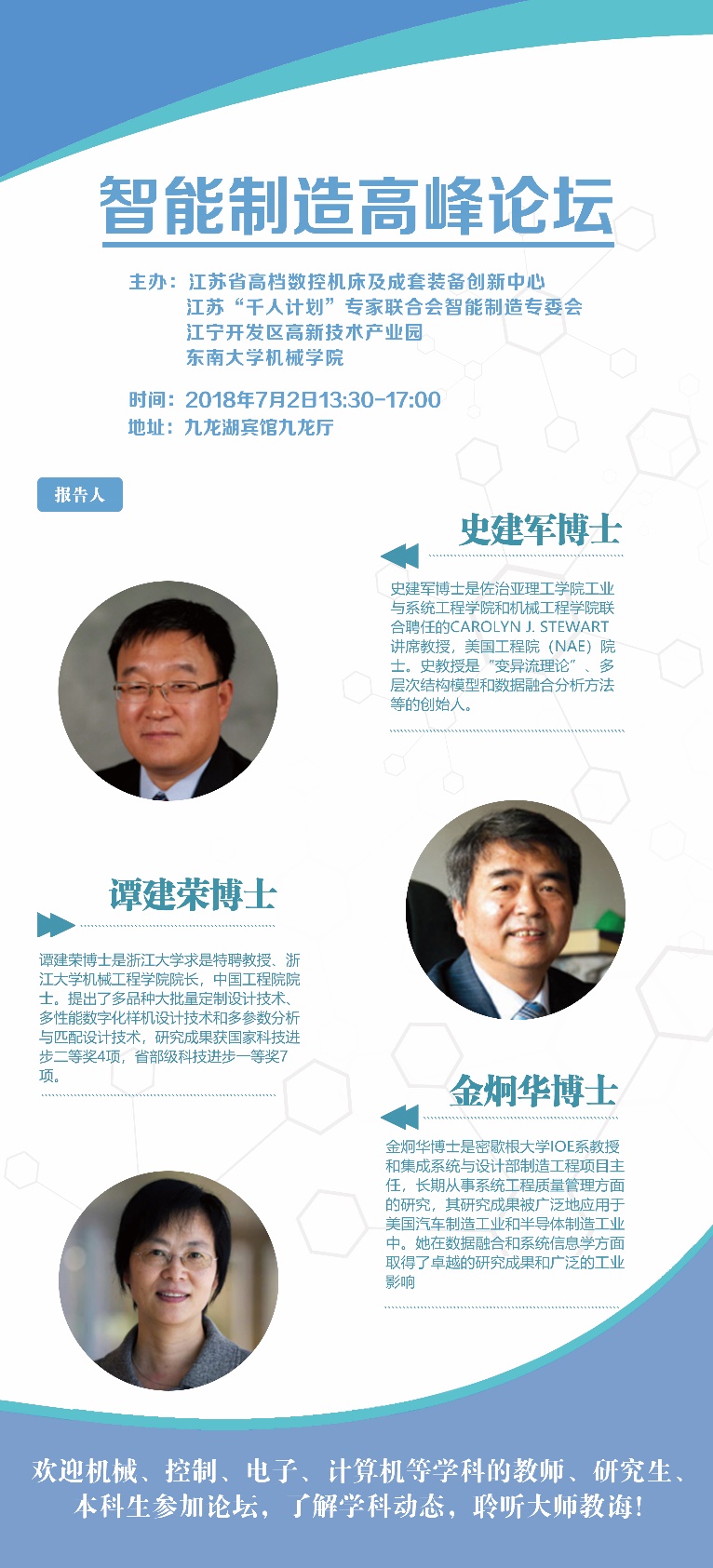 智能制造高峰论坛将于2018年7月2日13:30-17:00在九龙湖宾馆九龙厅举行,欢迎机械、控制、电子、计算机等学科的教师、研究生、本科生参加论坛,了解学科动态,聆听大师教诲!