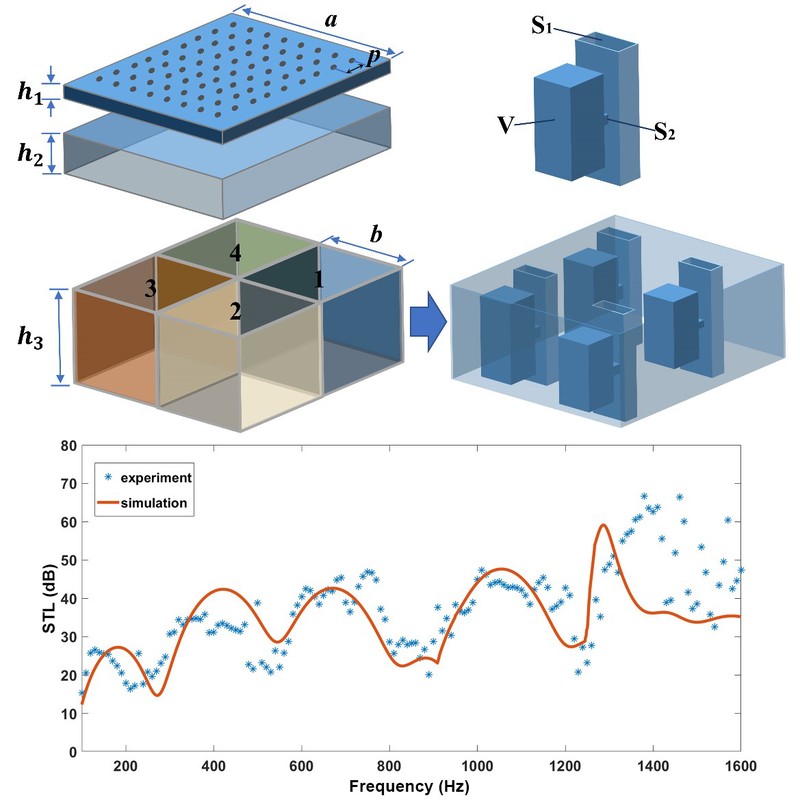 近日,华体会官方端网站登录入口张辉教授团队和法国国家科学院Badreddine Assouar教授团队合作提出一种超薄的基于声超表面的宽带低频消声器。该工作首次提出利用微穿孔板耦合多种参数的复合波导,通过耦合共振实现低频超宽带通风型隔声。在100-1600Hz四个倍频程范围内实现了高于20dB隔声量的隔声。而整个3-D打印的超表面样品的厚度只有6.2cm,对应于最大工作波长的1/55。结构的设计可通过电力声类比的等效电路模型进行理论分析,通过对比不同的结构参数,如穿孔板孔径、中间层的厚度,最终得到优化的隔声曲线。该设计在隔声效率、带宽、通风性和样品厚度四方面具有良好的表现。该工作极大地促进了在满足通风的前提下,声超表面在低频宽带隔声的应用。该工作在工程领域和实际应用场合具有广泛的应用前景。相关研究工作发表在《Physical Review Applied》上。