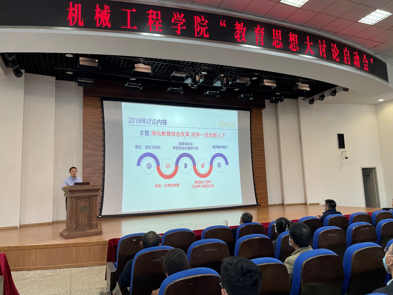 机械工程学院于2022年10月17日上午在九龙湖校区纪忠楼报告厅召开全院教职工大会,学院党委书记张志胜为全体教职工做了“立德树人的东大使命和生为首位的东大行动”教育思想大讨论启动报告,并做了师德师风专题教育。党委副书记王斌做了教育思想大讨论工作部署。倪中华院长做了“课比天大 生为首位”的总结报告。最后,学院新入职的教职工进行了自我介绍。