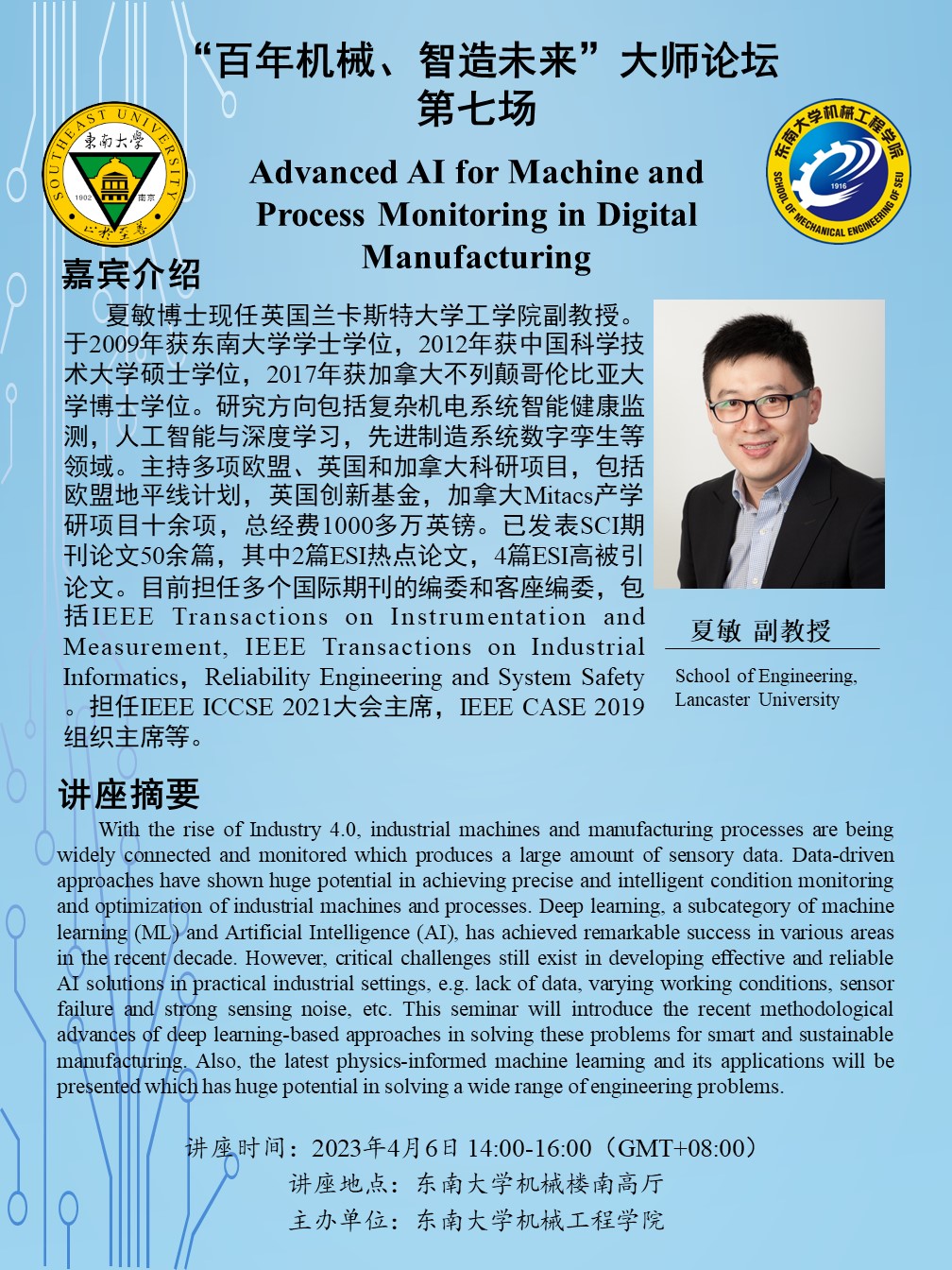 夏敏博士现任英国兰卡斯特大学工学院副教授。于2009年获东南大学学士学位,2012年获中国科学技术大学硕士学位,2017年获加拿大不列颠哥伦比亚大学博士学位。研究方向包括复杂机电系统智能健康监测,人工智能与深度学习,先进制造系统数字孪生等领域。主持多项欧盟、英国和加拿大科研项目,包括欧盟地平线计划,英国创新基金,加拿大Mitacs产学研项目十余项,总经费1000多万英镑。已发表SCI期刊论文50余篇,其中2篇ESI热点论文,4篇ESI高被引论文。目前担任多个国际期刊的编委和客座编委,包括IEEETransactions on Instrumentation and Measurement, IEEE Transactions onIndustrial Informatics,Reliability Engineering and System Safety。担任IEEE ICCSE2021大会主席,IEEE CASE 2019组织主席等。