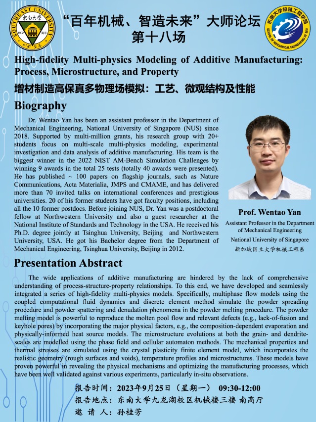 Dr. Wentao Yan has been an assistant professor in the Department of Mechanical Engineering, National University of Singapore (NUS) since 2018. Supported by multi-million grants, his research group with 20+ students focus on multi-scale multi-physics modeling, experimental investigation and data analysis of additive manufacturing. His team is the biggest winner in the 2022 NIST AM-Bench Simulation Challenges by winning 9 awards in the total 25 tests (totally 40 awards were presented). He has published ~ 100 papers on flagship journals, such as Nature Communications, Acta Materialia, JMPS and CMAME, and has delivered more than 70 invited talks on international conferences and prestigious universities. 20 of his former students have got faculty positions, including all the 10 former postdocs. Before joining NUS, Dr. Yan was a postdoctoral fellow at Northwestern University and also a guest researcher at the National Institute of Standards and Technology in the USA. He received his Ph.D. degree jointly at Tsinghua University, Beijing and Northwestern University, USA. He got his Bachelor degree from the Department of Mechanical Engineering, Tsinghua University, Beijing in 2012.