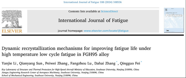 近日,航空航天系费庆国教授团队在金属高温疲劳领域取得重要进展,相关研究成果以“Dynamic recrystallization mechanisms for improving fatigue life under high temperature low cycle fatigue in FGH95 alloy”为题在疲劳研究领域TOP期刊《International Journal of Fatigue》上发表。