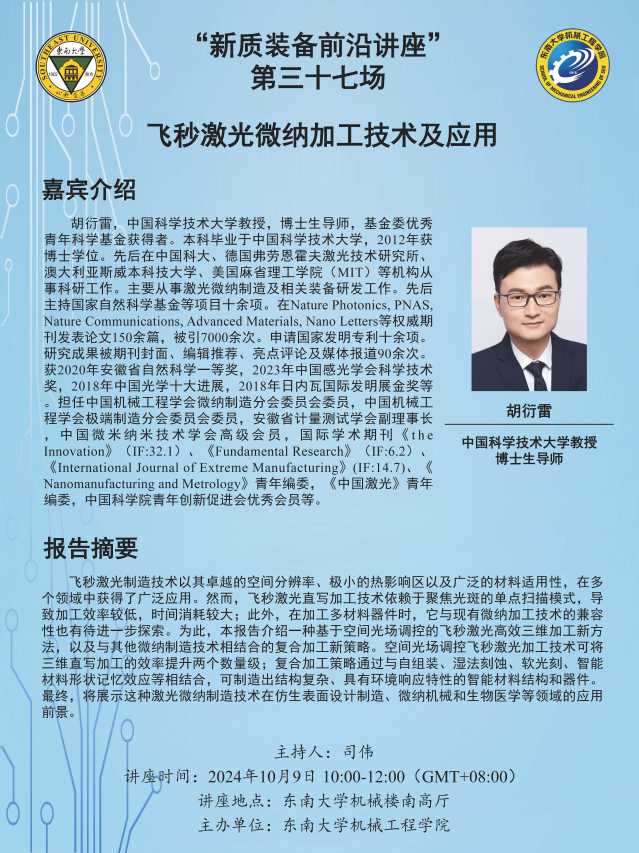 “新质装备前沿讲座” 第三十七场:胡衍雷教授——飞秒激光微纳加工技术及应用