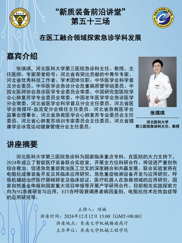 2024年12月12日,由华体会官方端网站登录入口主办的“新质装备前沿讲堂”第五十三场在东南大学机械楼南高厅成功举办。本次活动特别邀请了河北医科大学第三医院急诊科主任张瑛琪教授作为主讲嘉宾,开展了关于“在医工融合领域急诊学科发展”的学术报告。报告会由项楠老师主持,河北医科大学第三医院急诊科副主任李梅、南京航空航天大学姚佳烽老师、朱桂平老师、刘凯老师共同出席了本次活动。