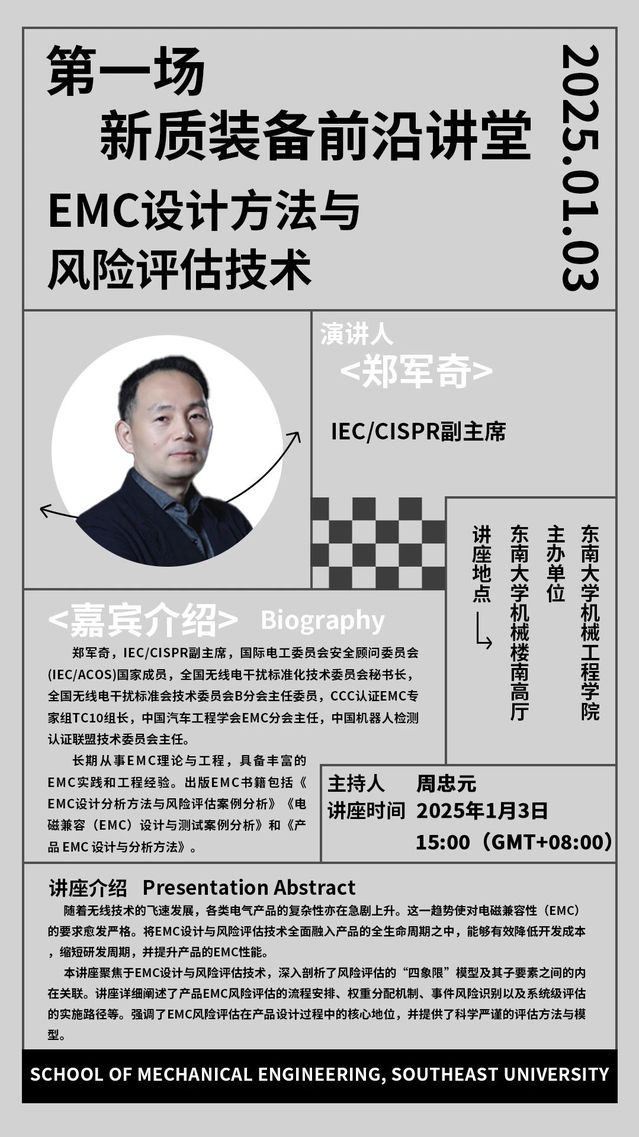 2025年机械学院“新质装备前沿讲堂”第一场:郑军奇主席——EMC设计方法与风险评估技术