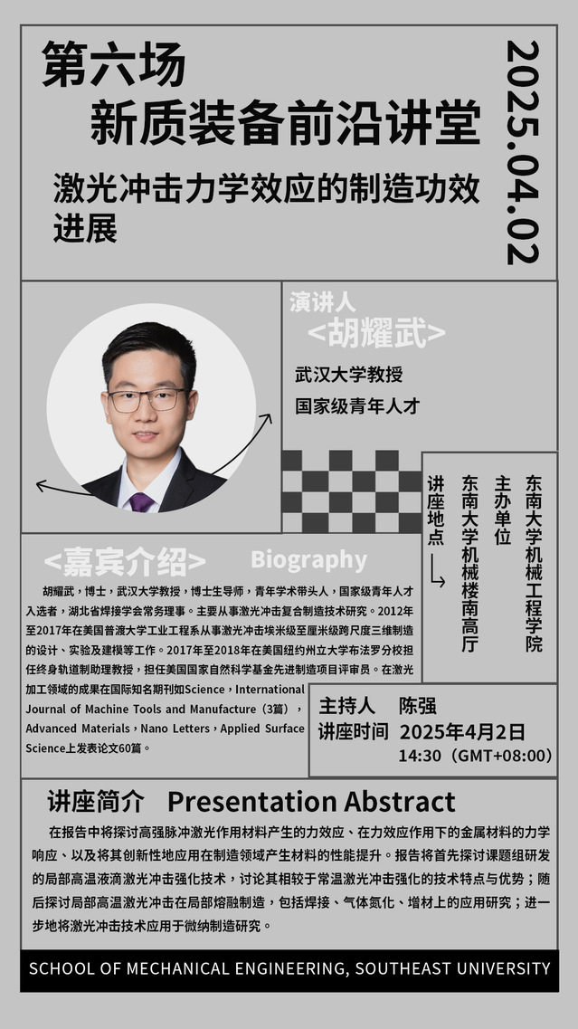 在报告中将探讨高强脉冲激光作用材料产生的力效应、在力效应作用下的金属材料的力学响应、以及将其创新性地应用在制造领域产生材料的性能提升。报告将首先探讨课题组研发的局部高温液滴激光冲击强化技术,讨论其相较于常温激光冲击强化的技术特点与优势;随后探讨局部高温激光冲击在局部熔融制造,包括焊接、气体氮化、增材上的应用研究;进一步地将激光冲击技术应用于微纳制造研究。