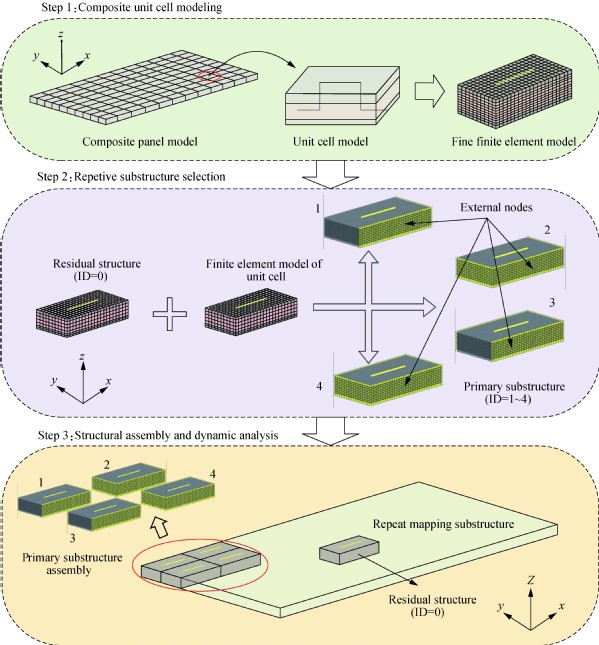 根据复合材料具有可重复单胞的特征,提出一种基于重复子结构的缝合式夹芯板动力学建模方法。利用复合材料精细化单胞有限元模型构造初始子结构和残余结构,通过空间位置关系映射得到重复子结构,将所有子结构组装到残余结构上,实现复合材料重复子结构动力学建模及分析。以缝合式夹芯板为例,对其进行重复子结构建模及动态特性分析,并与精细化实体有限元模型进行对比,验证方法的计算精度和效率。研究了初始子结构外部节点选取、残余结构位置选取、初始子结构尺寸选取对重复子结构建模及分析结果的影响。结果表明:针对具有重复性单胞的缝合式夹芯板结构,利用重复子结构进行动力学建模,残余结构的选取具有不唯一性,且初始子结构外部节点数量越多,重复映射过程越少,计算精度和计算效率越高;当初始子结构外部节点选取比例为50%时,相比较复合材料结构的精细化建模方法,可以提高结构动态分析效率。