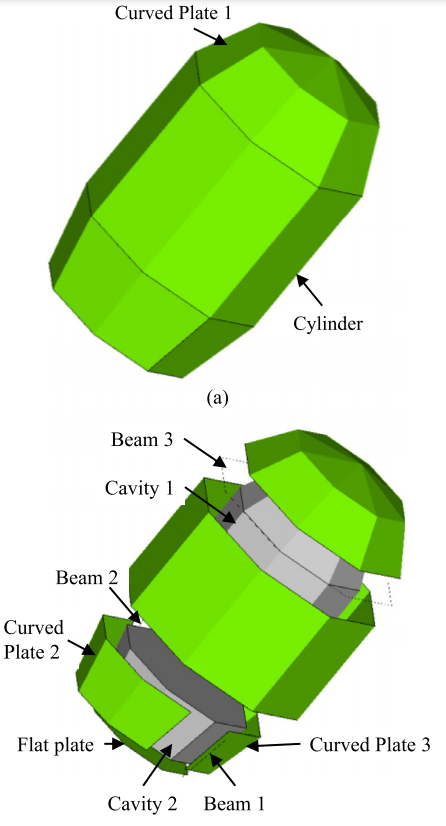 Fig. SEA model of a simplified launch vehicle fairing. (a): overall model, (b): shrink model.
