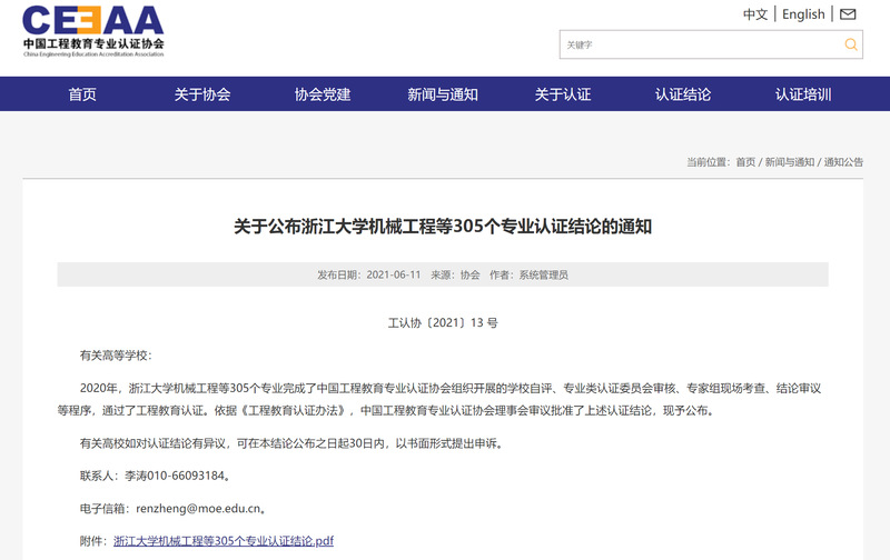 近日,中国工程教育专业认证协会发布了《关于公布浙江大学机械工程等305个专业认证结论的通知》(工认协〔2021〕13号),通知公示了2020年参加全国工程教育专业认证的认证结论。东南大学机械工程专业顺利通过认证,有效期6年(2021年-2026年),这是东南大学机械工程专业第四次通过教育部工程教育专业认证。从2007年至今,全国机械类专业通过教育部工程教育专业认证最多为4次,目前仅有4所985高校的机械类专业通过4次专业认证。机械工程专业也是2020年东南大学通过教育部工程教育专业认证的唯一专业。