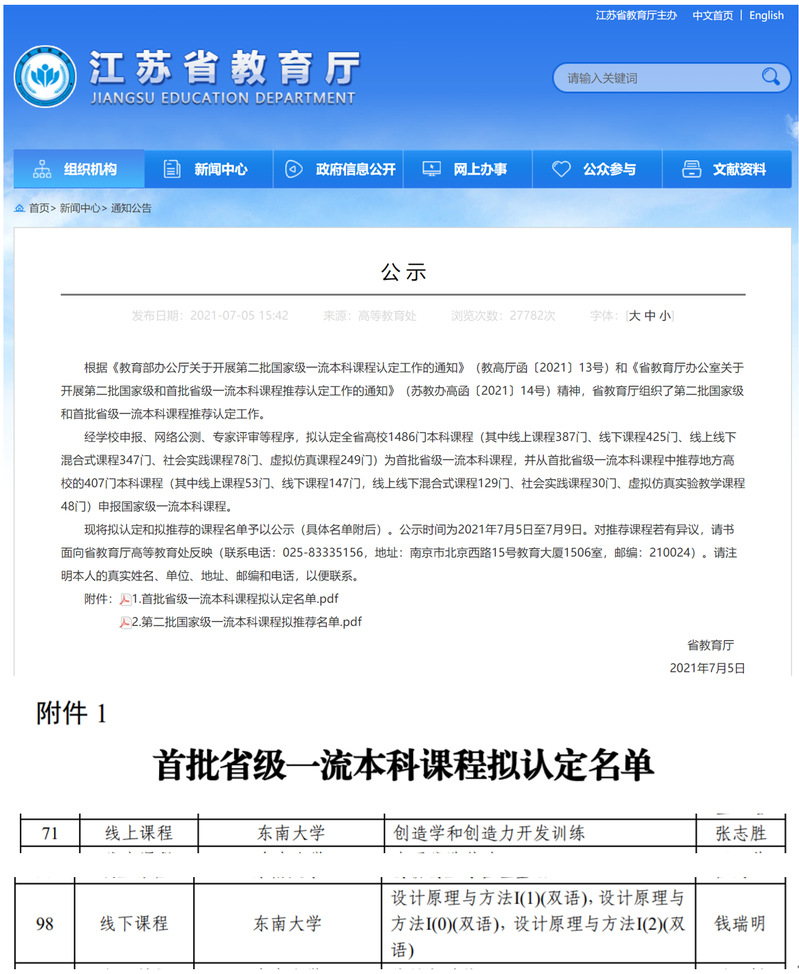 江苏省教育厅于7月5日发布首批省级一流本科课程认定结果的公示,机械工程学院张志胜教授负责的《创造学与创造力开发训练》获批线上一流本科课程,钱瑞明教授负责的《设计原理与方法Ⅰ(1)(双语)、设计原理与方法Ⅰ(0)(双语)、设计原理与方法Ⅰ(2)(双 语)》获批线下一流本科课程,并且两门课程都获推荐申报第二批国家级一流本科课程。这是继贾民平教授的《机械工程测试与控制技术(2)》获得首批国家级一流本科课程之后,我院教学工作取得的又一突破性成果。下一步,学院将充分发挥一流课程的示范引领作用,进一步加大一流课程建设力度,持续推进课程改革创新,着力打造更多具有高阶性、创新性和挑战度的“金课”,推动课堂教学水平和人才培养质量再上新台阶。