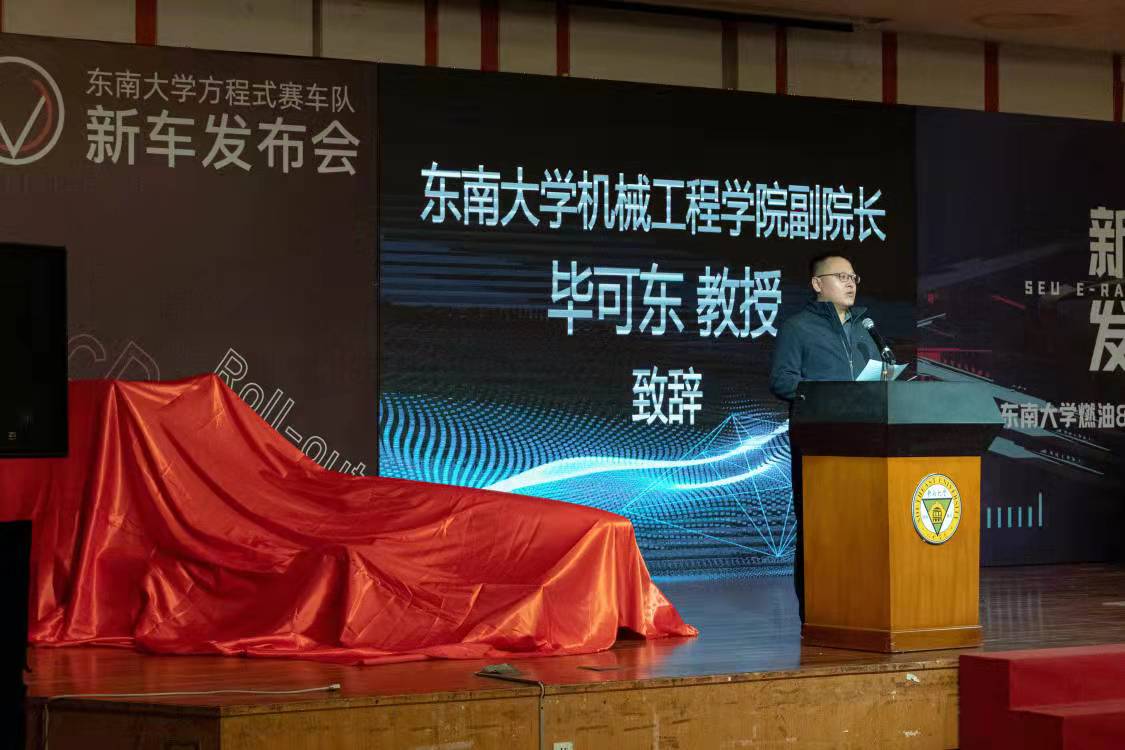 东南大学教务处处长殷国栋致辞。他表示,学校一直致力于给学生打造从理论教学到实践教学的实践平台,学生从设计到造出来,到参加比赛,是一个全流程培养学生的过程,这次新车发布会,从油车到电车,希望给学生创造一个亲手实践汽车工程科技的实验平台。