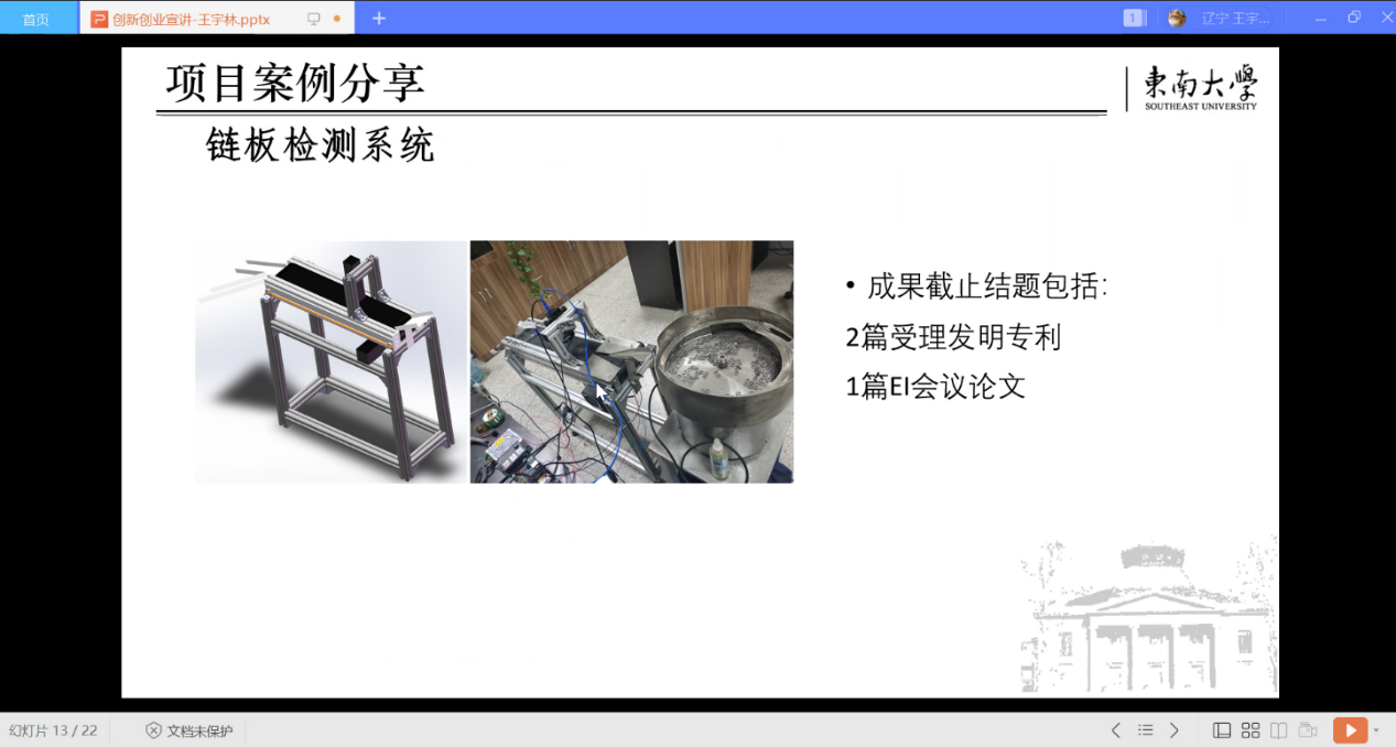 2月18日下午,创新创业训练交流线上讲座开讲,由机械工程学院2021级硕士生王宇林学长进行讲解。王宇林学长强调创新的逻辑性和严谨性,因为没有任何一个新事物是凭空而就的。他以自己曾经申请过专利以及参加竞赛的经历,凭借浅显易懂的论述向我们介绍了自己的创新结果——链板检测系统,并详细说明了它的逻辑、原理、设计理想、发展历程,以及现如今它可能在生活中涉及的地方。在讲座的最后,王宇林学长鼓励大家积极地加入创新创业这个“大家庭”中,要利用好现有的资源去发掘自身的能力。