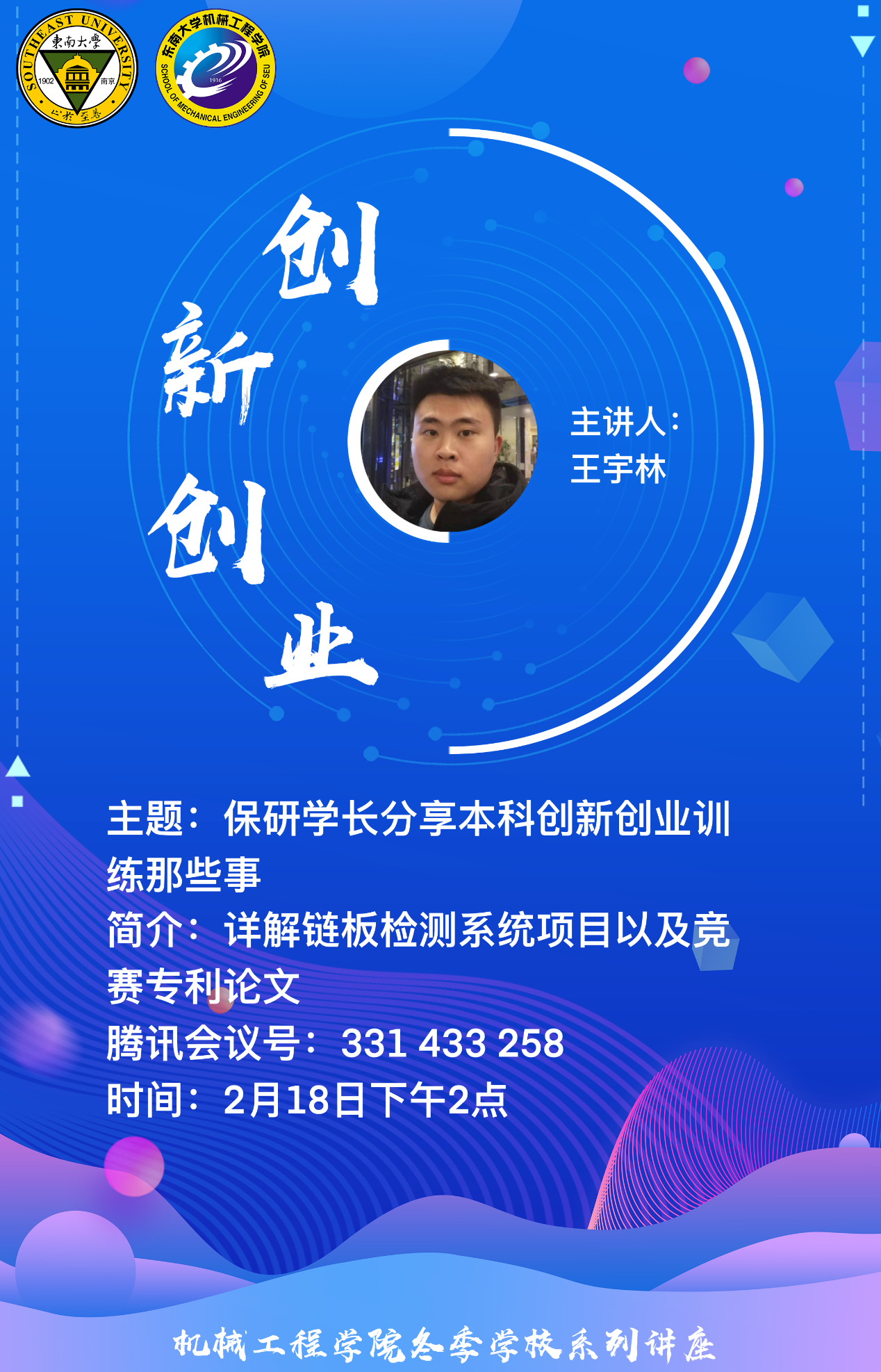 2月18日下午,创新创业训练交流线上讲座开讲,由机械工程学院2021级硕士生王宇林学长进行讲解。王宇林学长强调创新的逻辑性和严谨性,因为没有任何一个新事物是凭空而就的。他以自己曾经申请过专利以及参加竞赛的经历,凭借浅显易懂的论述向我们介绍了自己的创新结果——链板检测系统,并详细说明了它的逻辑、原理、设计理想、发展历程,以及现如今它可能在生活中涉及的地方。在讲座的最后,王宇林学长鼓励大家积极地加入创新创业这个“大家庭”中,要利用好现有的资源去发掘自身的能力。