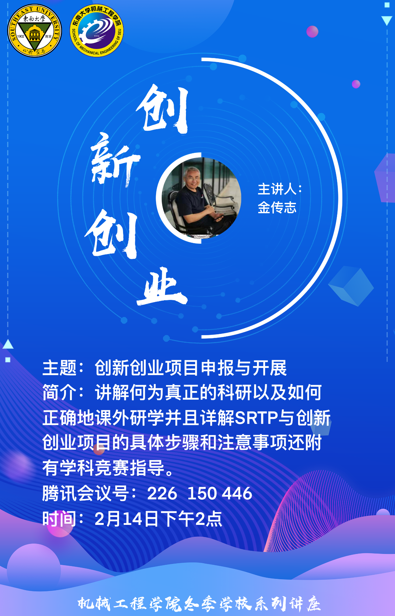 为进一步开阔学生视野、促进交流,帮助学生获得丰富的学术滋养,促进学生德智体美劳全面发展,为低年级本科生开展创新创业训练活动提供指导,机械工程学院在2021-2022学年冬季学校期间为低年级本科生开展了创新创业指导系列讲座。