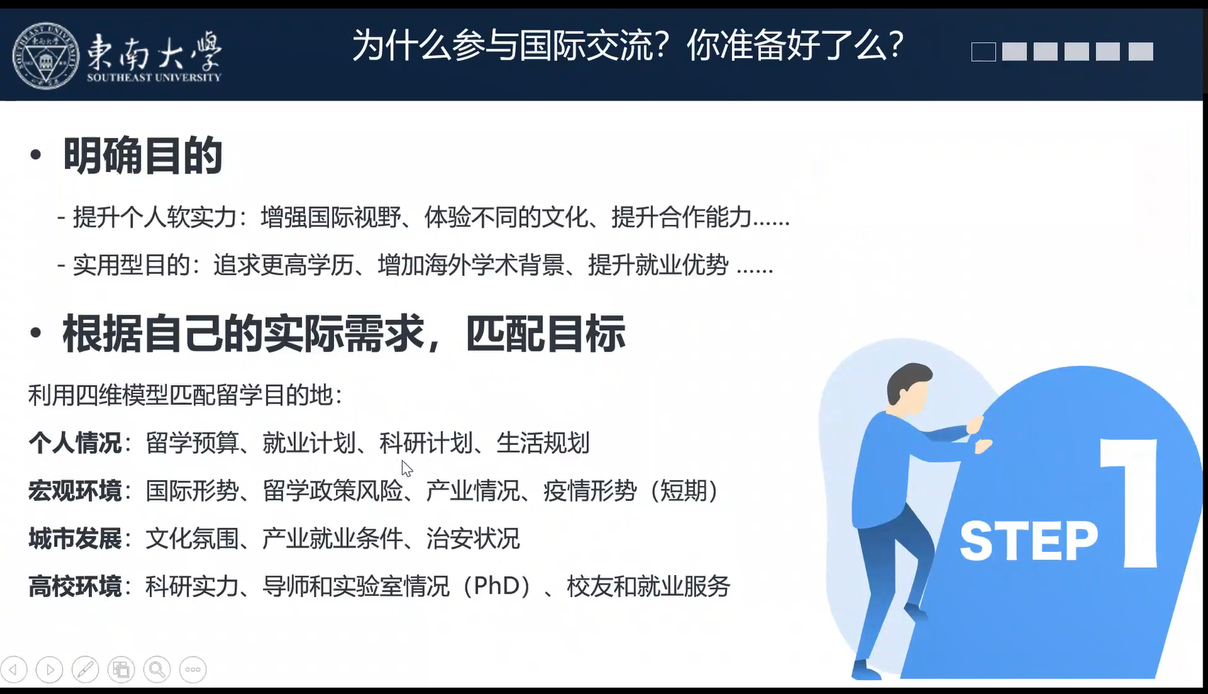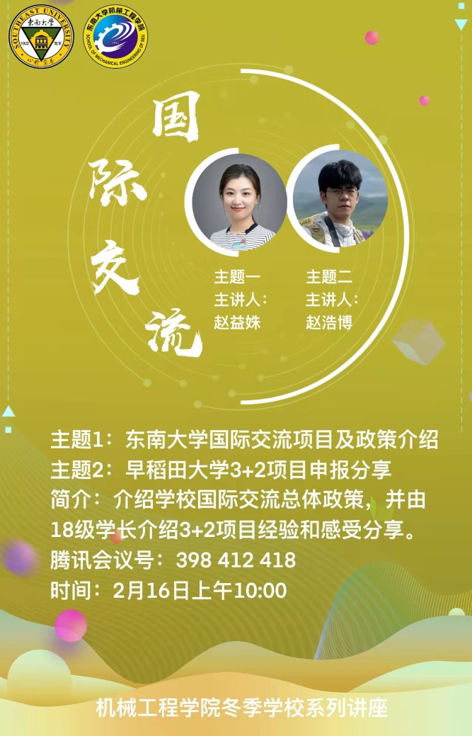 2月16日上午,国际交流讲座系列的首场讲座在线上开展,国际交流合作处的赵益姝老师以及2018级本科生赵浩博学长分别对东南大学国际交流整体政策、早稻田大学3+2项目进行了分享。赵老师主要对目前申报较多的交流项目进行了分析讲解,并概括了校内手续办理的一般步骤,对校内各部门的分工进行了简要介绍。最后,赵老师也对参加国际交流的目的进行了进一步概括,也希望同学们可以结合自身情况,选取最适合自己的项目。赵浩博学长则以早稻田大学的基本情况以及地理环境开题,讲述了所申报项目的学院构成及整个学期的具体时间安排和课程安排。最后,赵浩博学长对申报该项目的要求和所需的资料进行了概括,并对申报该项目的优势进行了分析总结,也希望感兴趣的同学可以积极参与。