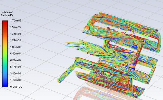 水冷电机是通过向壳体内部水道注入冷却水来对电机进行散热的一种电机,一般以电机机座水冷为主,部分机型的端盖也可设计成水冷结构。水冷机座有一个进水口及出水口,壳体内部有多条水道,这样可以充分发挥水冷的优势,带走更多电机所产生热量。由于客户对于水道水阻数据的需求,并且整体电机的散热所需考虑因素太过繁多,无法进行,因此此次项目我们是对水道的水阻进行ansys的仿真分析。
