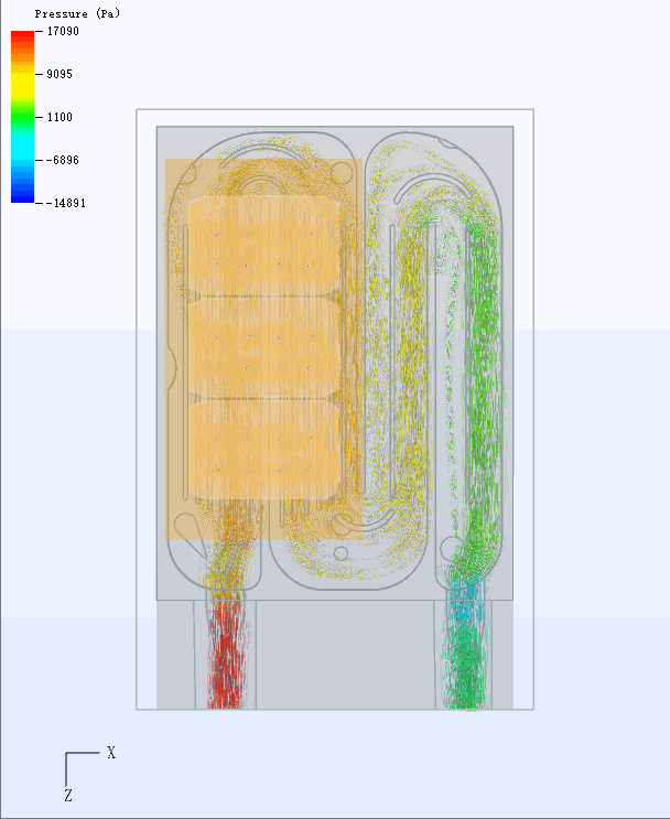 3)对于流体而言,其进出口压力越大证明其在水道内流动的阻力越大,而阻力越大其流速将变缓,这会影响最终的散热效果。