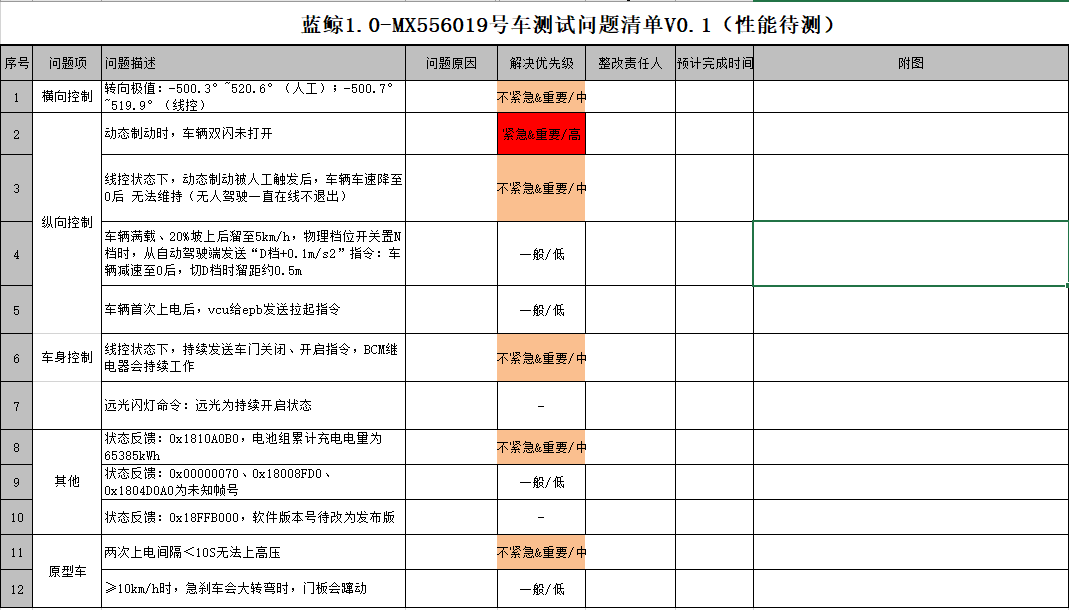 1)项目简介(不超过100字):对蓝鲸号MX556019线控车辆性能测试及数据分析分析总结现有线控性能测试方法和测试用例,形成报告。在此基础上,对开沃无人驾驶线控车辆的线控性能进行系统性现场测评,完成测试数据的整理、分析及报告编制。