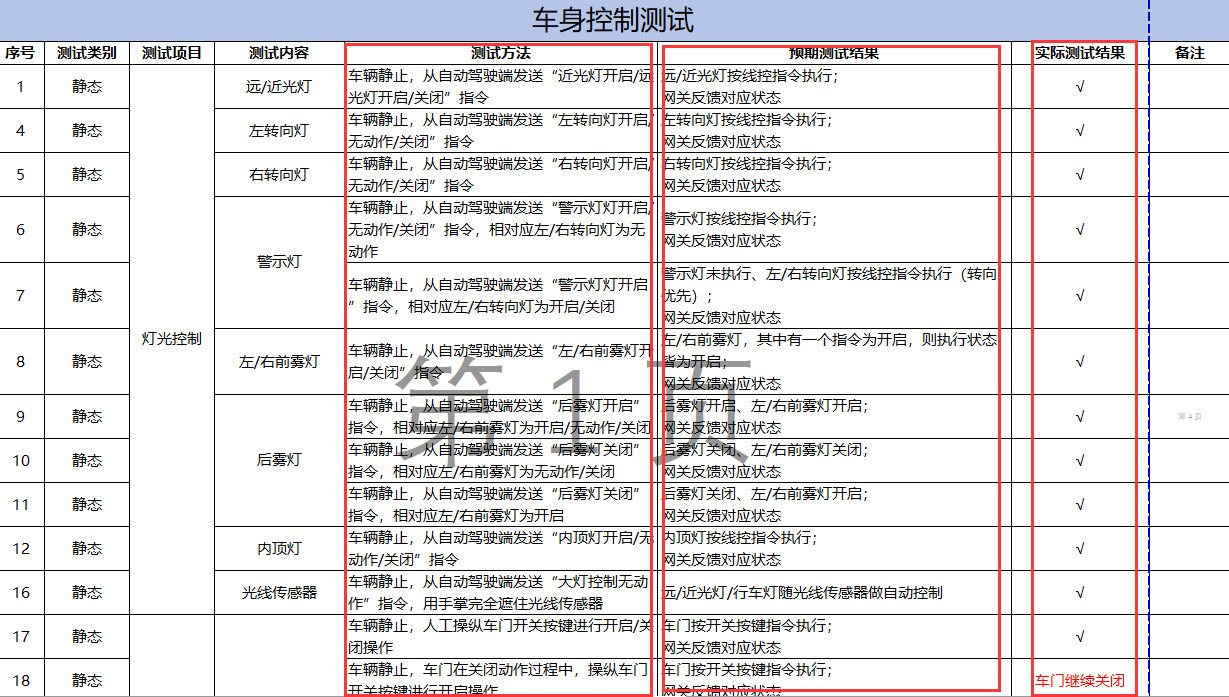 主要完成了急停控制、车身控制、纵向控制、横向控制以及其他相关测试,得到了蓝鲸号功能总结报告与性能测试报告,共测试了150项,其中未通过有21项,通过率为86%