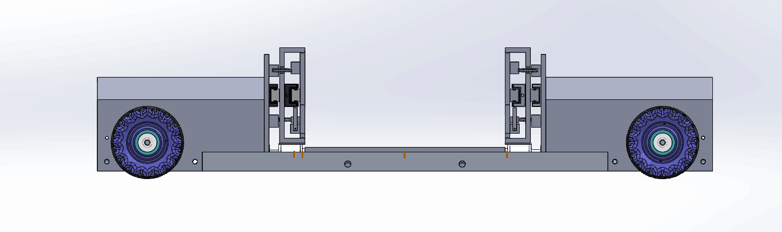 通过该抬升机构,将大轮抬起,使其在最高点时仅有大轮着地,在最低点时只有小轮着地,大小轮交错布置实现四向移动。