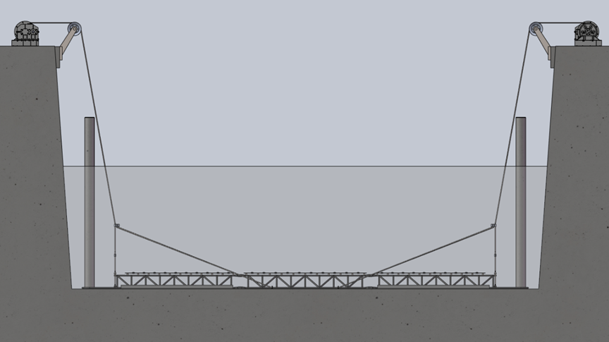 整体结构设计与仿真。对各个机构进行具体设计,并绘出三维模型,在此基础上进行了静力学仿真和流体仿真,仿真结果表明,桁架结构强度和刚度满足设计需求,且水流对桁架整体结构影响较小。同时,分段式设计可以满足不同宽度河道的需求。